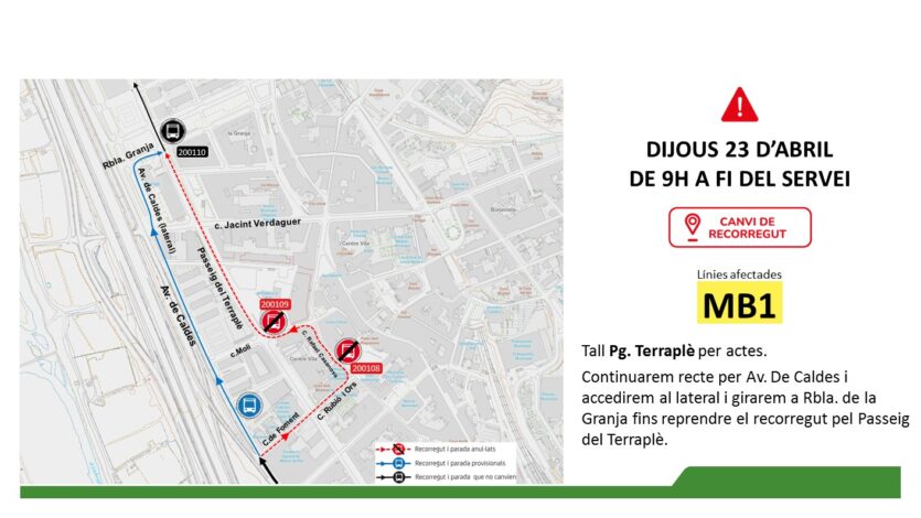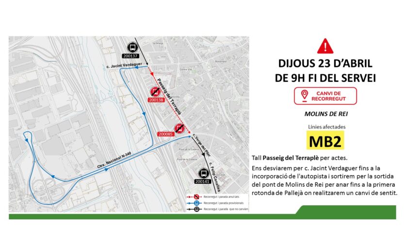 Dijous 23 d’abril de 9 a fi del servei, es modifica el recorregut habitual a Pg. Terraplè de Molins de Rei amb l’anul·lació provisional de les parades afectades.