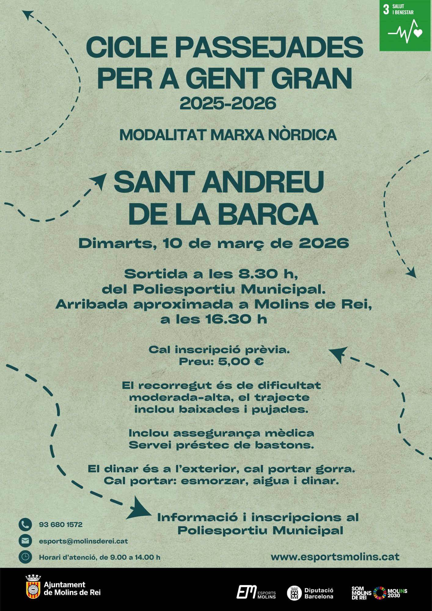 Sortida a les 8.30 h, del Poliesportiu Municipal. Arribada aproximada a Molins de Rei, a les 16.30 h.