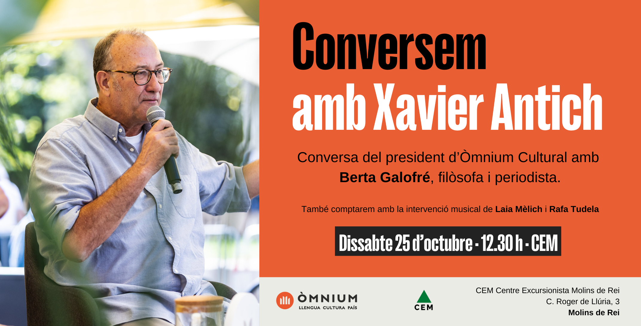 Conversa del president d’Òmnium Cultural amb la filòsofa i periodista Berta Galofré, amb les actuacions musicals intercalades del duet Laia Mèlich i Rafa Tudela. L’acte es farà el pròxim dissabte 25 d’octubre a les 12.30 h al CEM-Centre Excursionista Molins de Rei (c. Roger Llúria, 3. Molins de Rei, Localització). Acabada l’actuació s’oferirà un aperitiu als assistents.