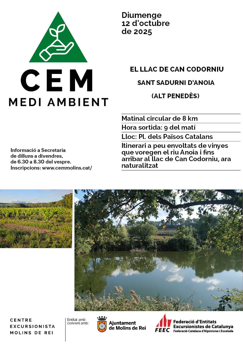 Diumenge 12 d’octubre. Secció de Medi Ambient: El llac de Can Codorniu (Sant Sadurní d’Anoia, Alt Penedès). Caminada matinal de 8 Km per un hàbitat vegetal i faunístic sorprenent envoltat de vinyes. Inscripcions al CEM de dilluns a divendres de 18:30 a 20:30 h .