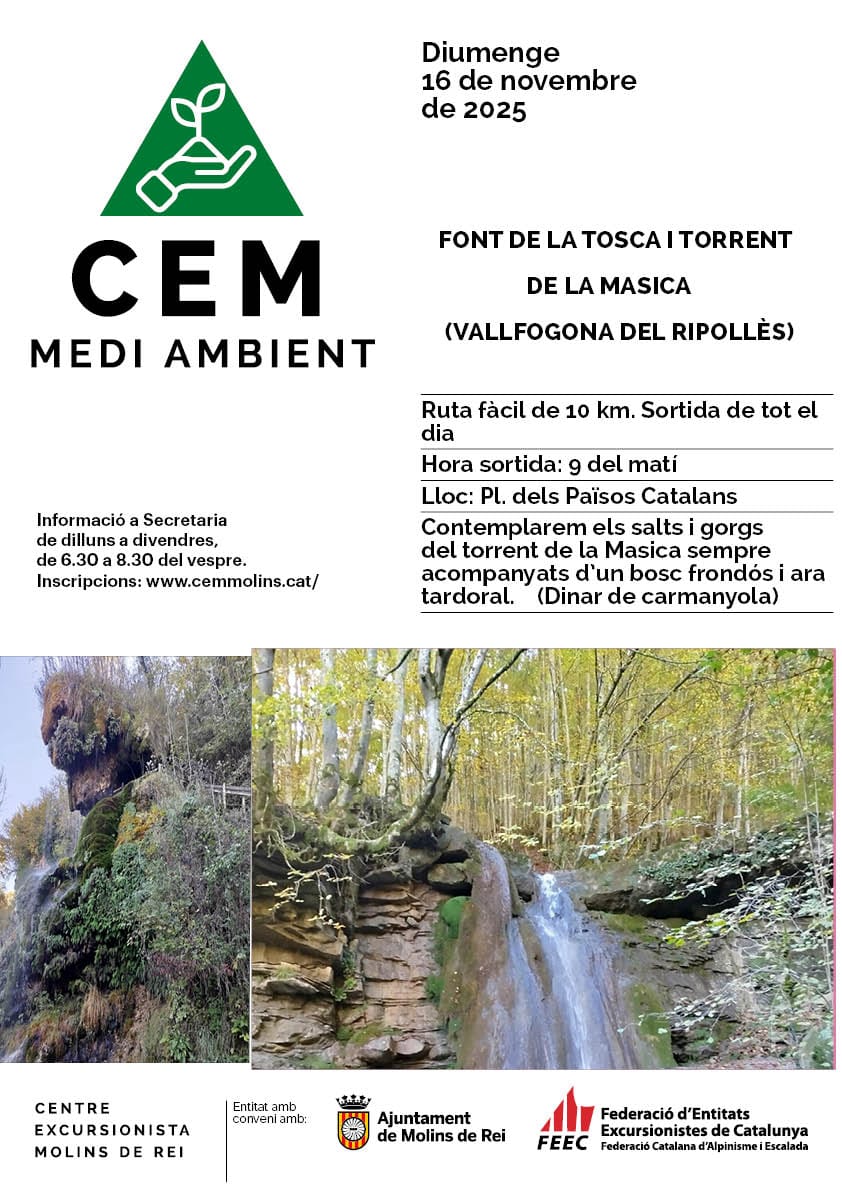 Diumenge 16 de novembre. Excursió a Vallfogona de Ripollès. Contemplarem els salts i gorgs del Torrent de la Masica sempre acompanyants d’un bosc frondós i tardoral. Ruta de 10 Km a peu. Excursió de tot el dia. Dinar de carmanyola. Sortida a les 9h matí de la Plaça dels Països Catalans de Molins de Rei. Inscripcions al CEM de 7 a 9 del vespre de dilluns a divendres.