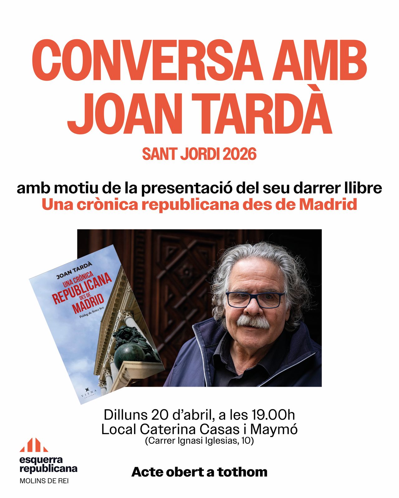 En motiu de la celebració de la Diada de Sant Jordi, el dilluns 20 d’abril, el polític Joan Tardà presentarà el seu darrer llibre, “Una crònica republicana des de Madrid”, a les 7 del vespre al Local Caterina Casas i Maymó, situat al carrer Ignasi Iglesias número 10 (pujadeta de l’Església).