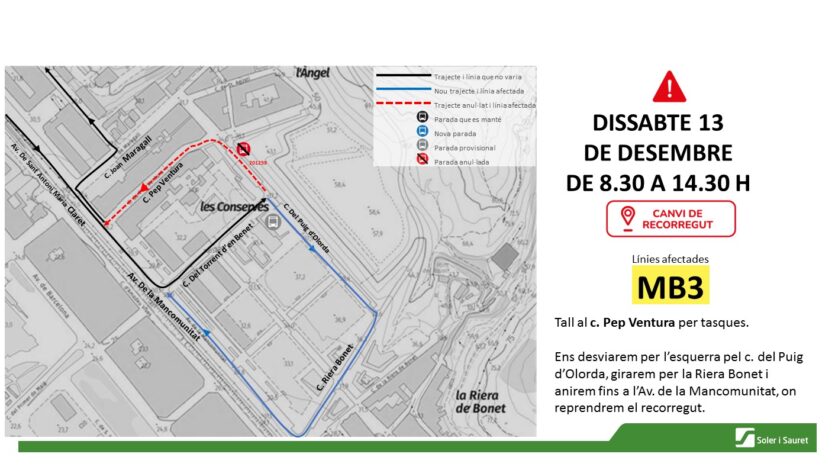 Dissabte 14 de desembre de 2025, de 8.30 a 14.30, la línia MB3 tindrà un canvi de recorregut atès al tall del c. Pep Ventura.