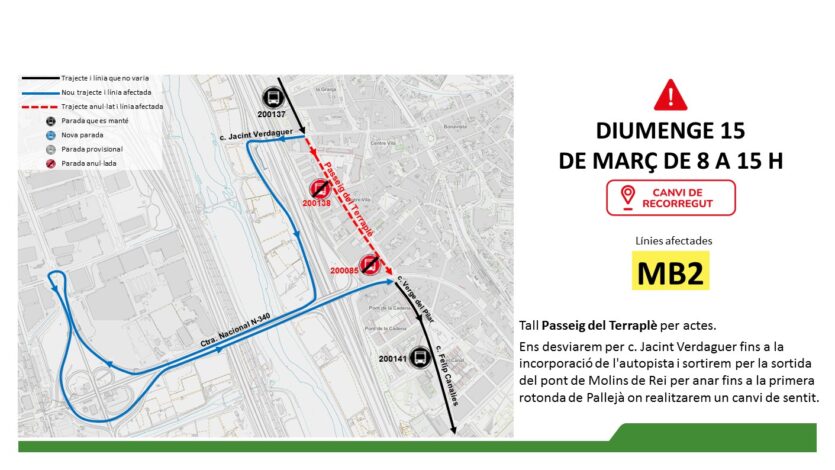 El diumenge 15 de març de 2026, es produiran canvis de recorregut en les línies MB1 i MB2 per actes a la via pública