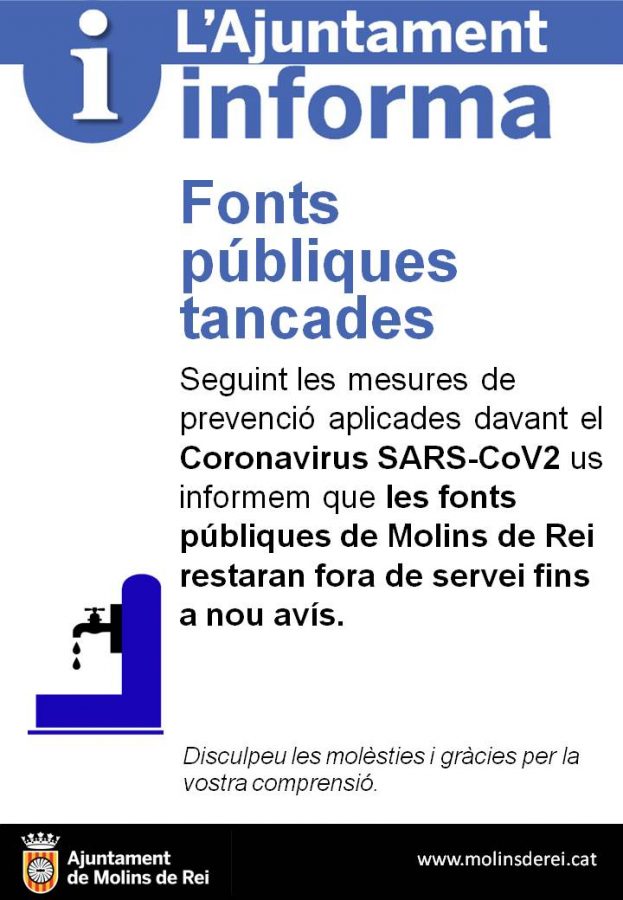 Seguint les mesures de prevenció aplicades davant el Coronavirus SARS-CoV2 us informem que les fonts públiques de Molins de Rei restaran fora de servei fins a nou avís.