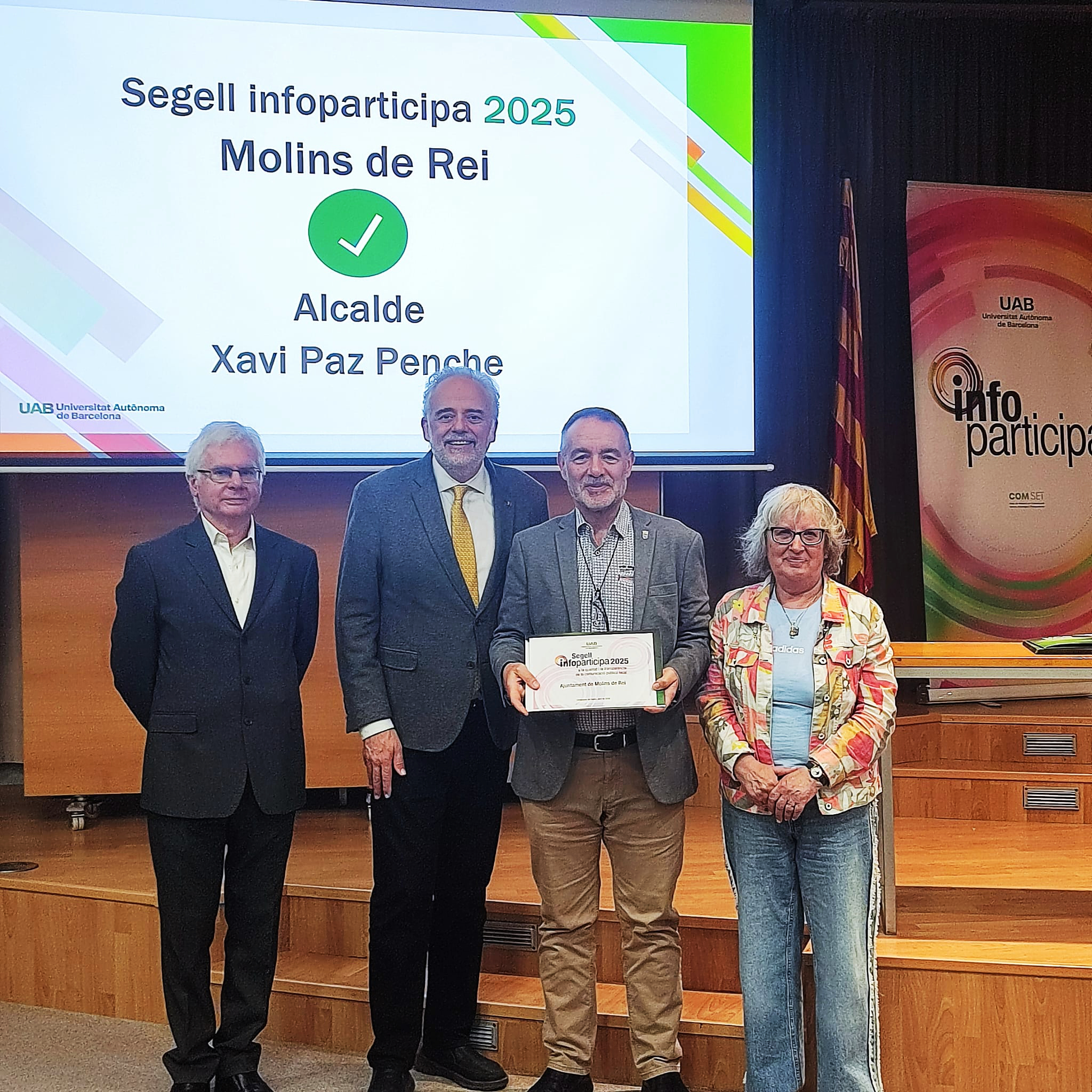 L’Ajuntament de Molins de Rei recollia ahir el segell Infoparticipa 2025, el reconeixement a la transparència que atorga el grup de recerca en Comunicació Sonora, Estratègica i Transparència (ComSET) de la Universitat Autònoma de Barcelona. Aquesta iniciativa avalua els portals dels 947 municipis d’arreu de Catalunya per destacar aquells ajuntaments que ofereixen una informació clara, accessible i actualitzada sobre la seva activitat. En aquesta edició han estat 124 els consistoris, un 13 % del total entre els quals es troba el de Molins de Rei, els que han obtingut el segell.
